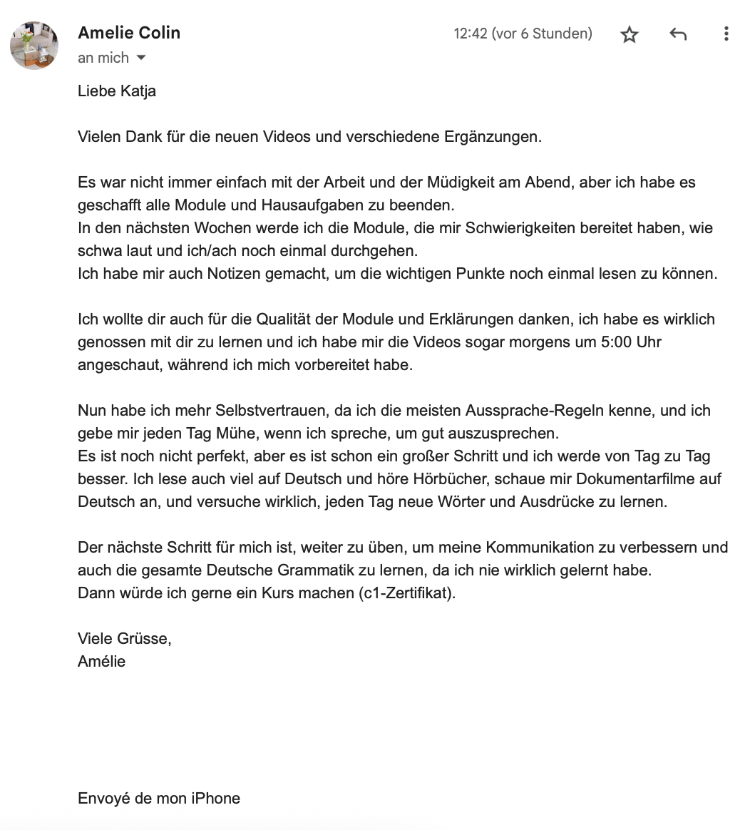 * Dieser Tarif ist perfekt für dich, wenn du fleißig, hochmotiviert und bereit bist, an deiner Aussprache sehr intensiv und selbstständig mithilfe von Katjas Kursmaterialien zu arbeiten.