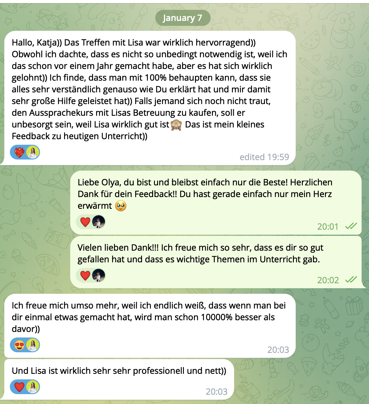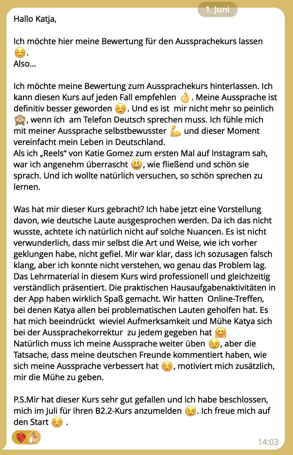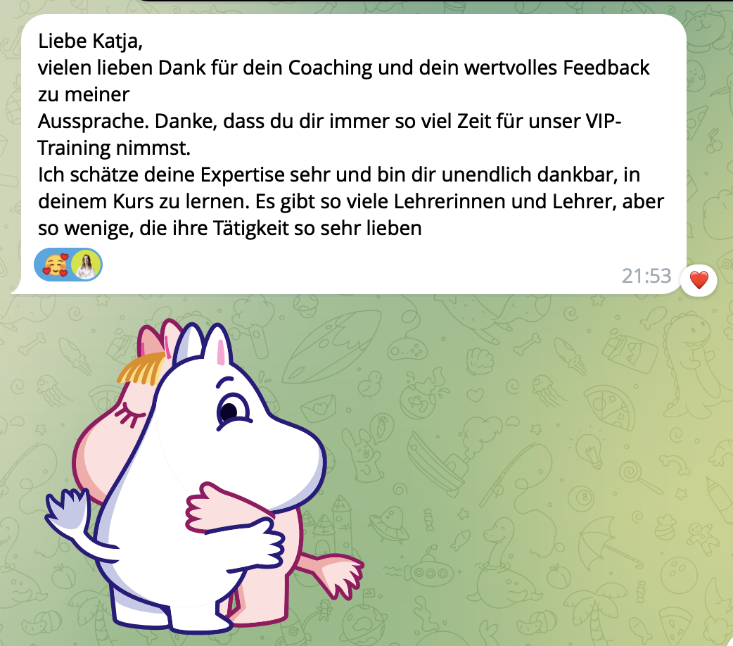 * Dieser Tarif ist perfekt für dich, wenn du fleißig, hochmotiviert und bereit bist, deine Aussprache persönlich von Katja korrigieren zu lassen, und sehr intensiv mit Lisa und Katja an deiner Aussprache zu arbeiten.