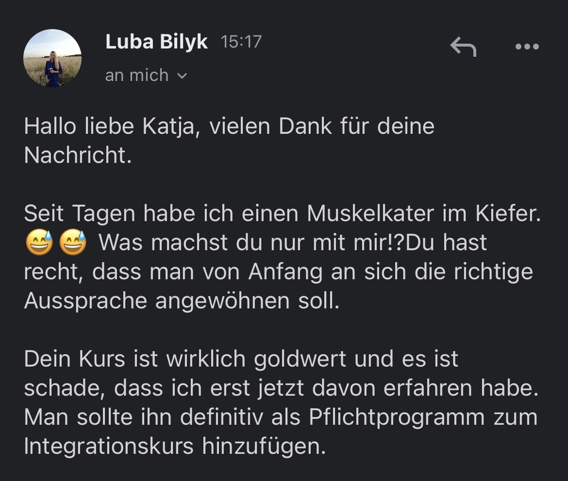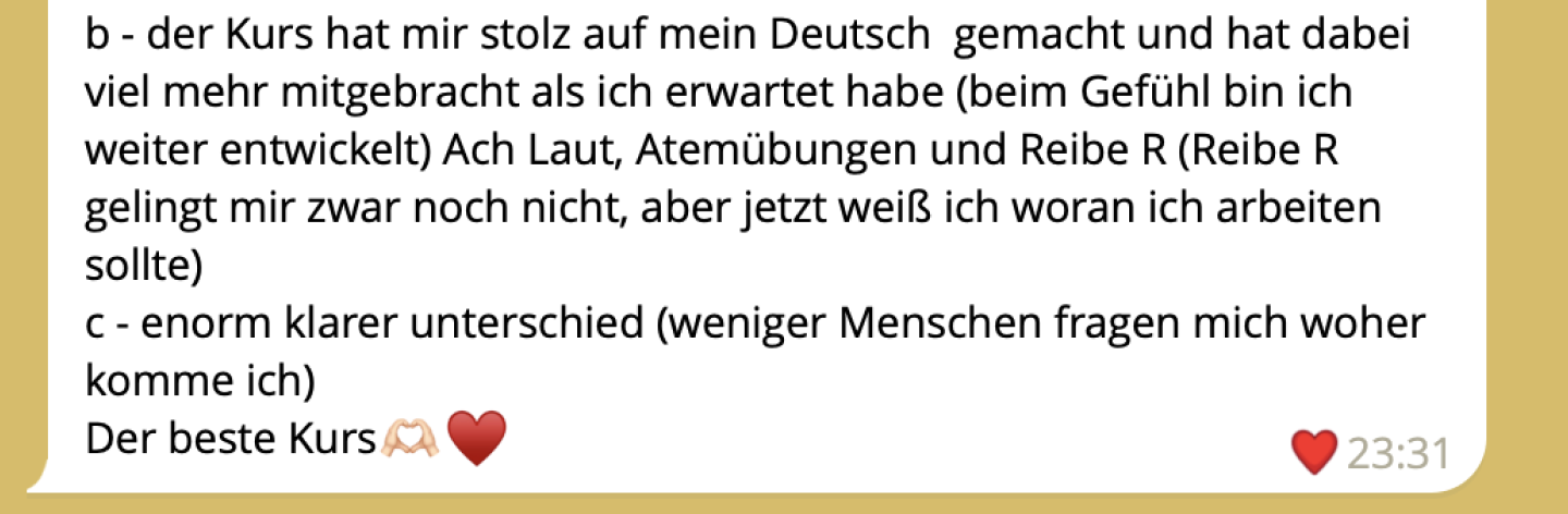 Ich kam im Erwachsenenalter mit A2 nach Deutschland. Innerhalb von 1,5 Jahren habe ich ein sicheres C1. Jetzt habe ich C2 und eine perfekte Aussprache, wie du es gerade im Video gehört hast.